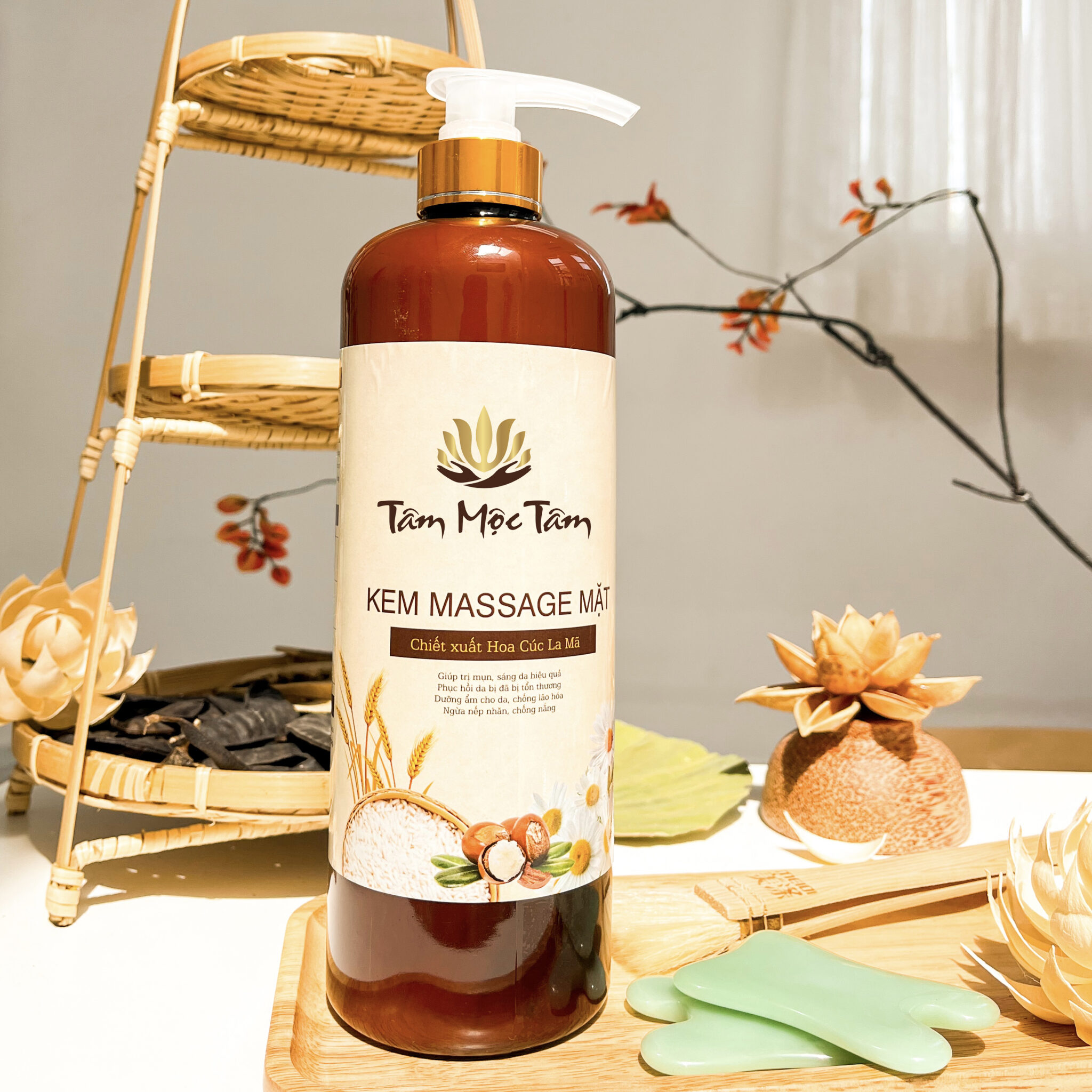 Kem Massage Mặt 1000ml tinh chất từ Hoa Cúc La Mã giàu vitamin B giúp trị mụn, sáng da hiệu quả. Vitamin B5 giúp phục hồi da đã bị tổng thương. Bơ hạt mỡ, dầu cám gạo có công dụng. Dưỡng ẩm cho da, hỗ trợ quá trình tái sinh tự nhiên của da, chống lão hóa, ngừa nếp nhăn, chống nắng, chữa viêm và dị ứng da.
